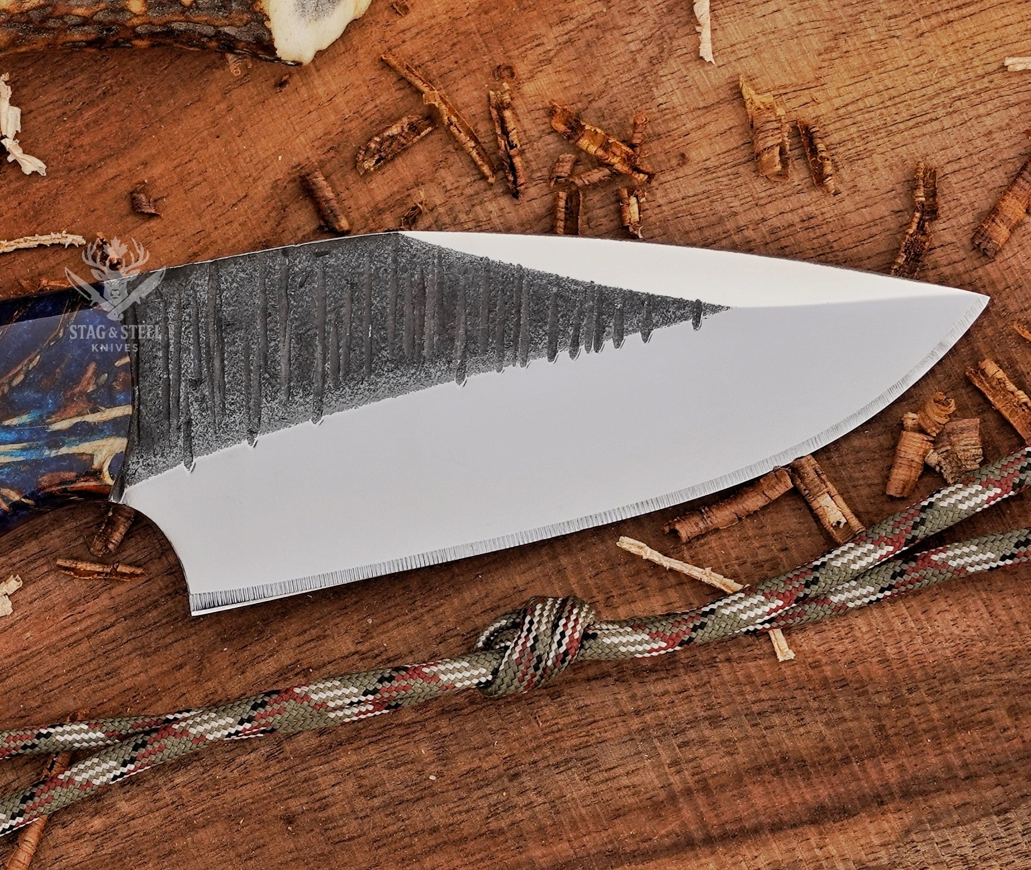 The pinecone resin handle is a modern touch that adds both beauty and function. Stabilized resin locks the pinecone in place, ensuring the handle remains weatherproof and warp-free, even when exposed to moisture. The ergonomic design and textured surface mean you get a secure grip even with gloves or wet hands, making it an essential tool for field dressing, deer processing, and beef skinning.