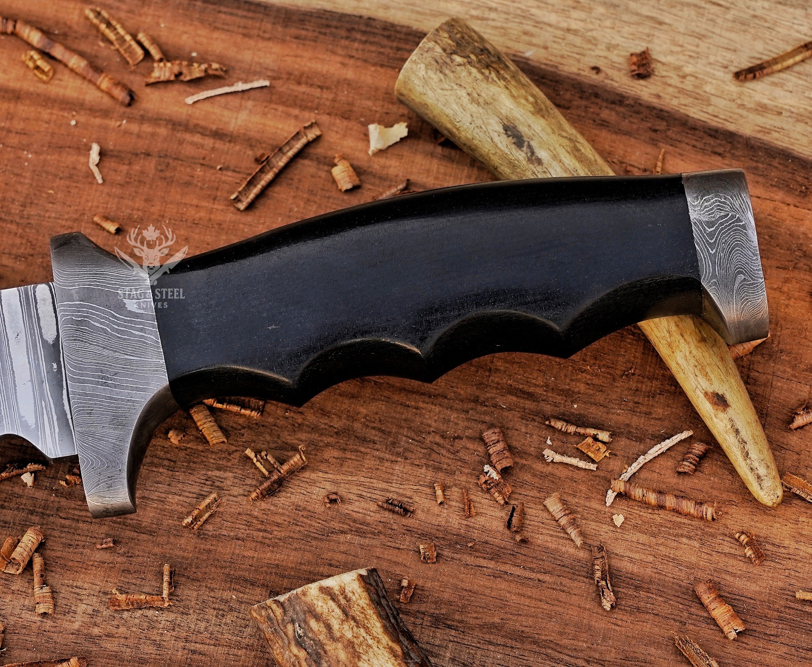 We designed this handmade Damascus knife for versatile purposes. It performs excellent well as a Damascus hunting knife, a Damascus bushcraft knife, or a Damascus camping knife. The fixed blade design is strong and durable. The partial tang provides a good balance of power and comfort when carrying.