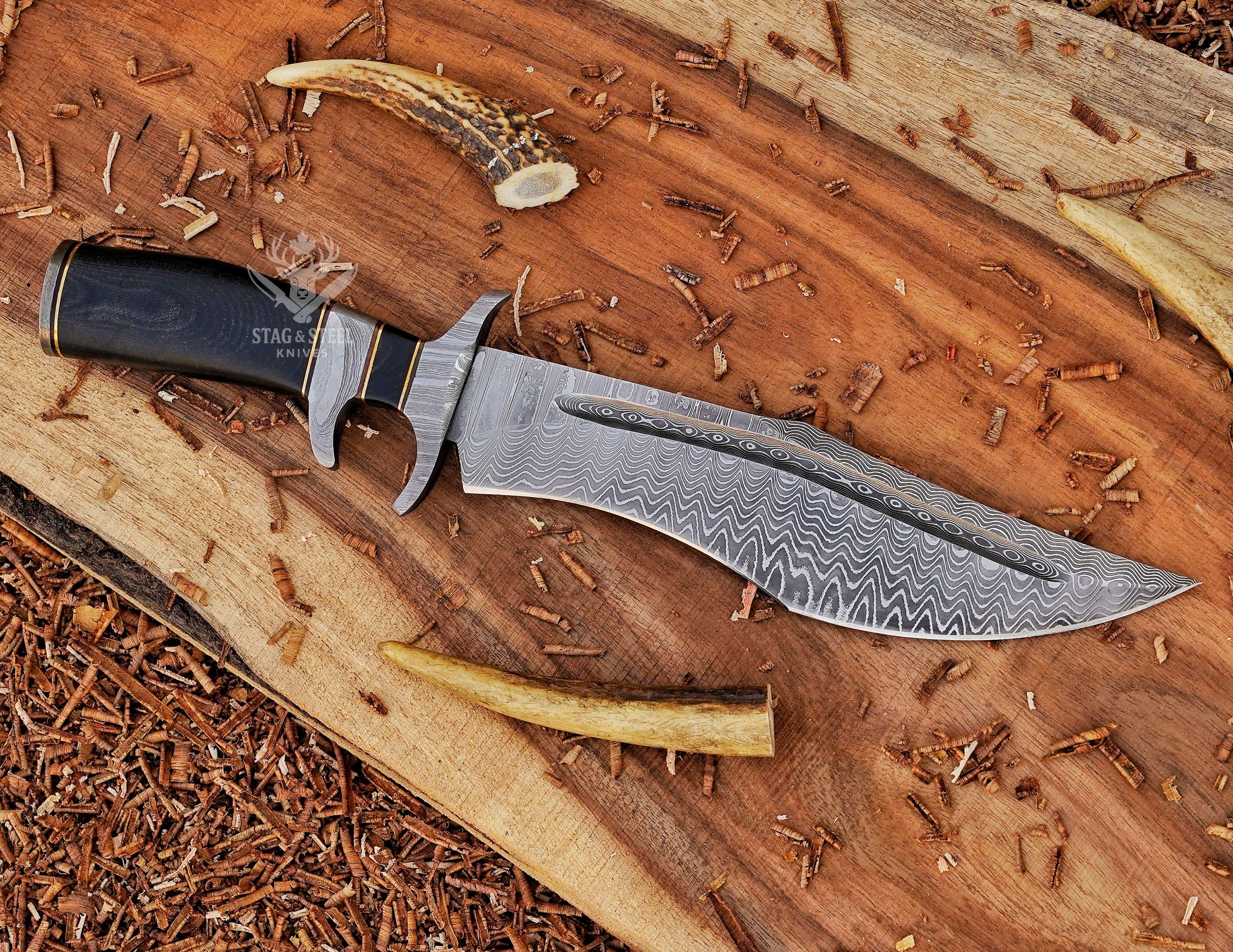 Handmade Damascus Bowie Knife: Stainless Steel Blade, Black Micarta Handle