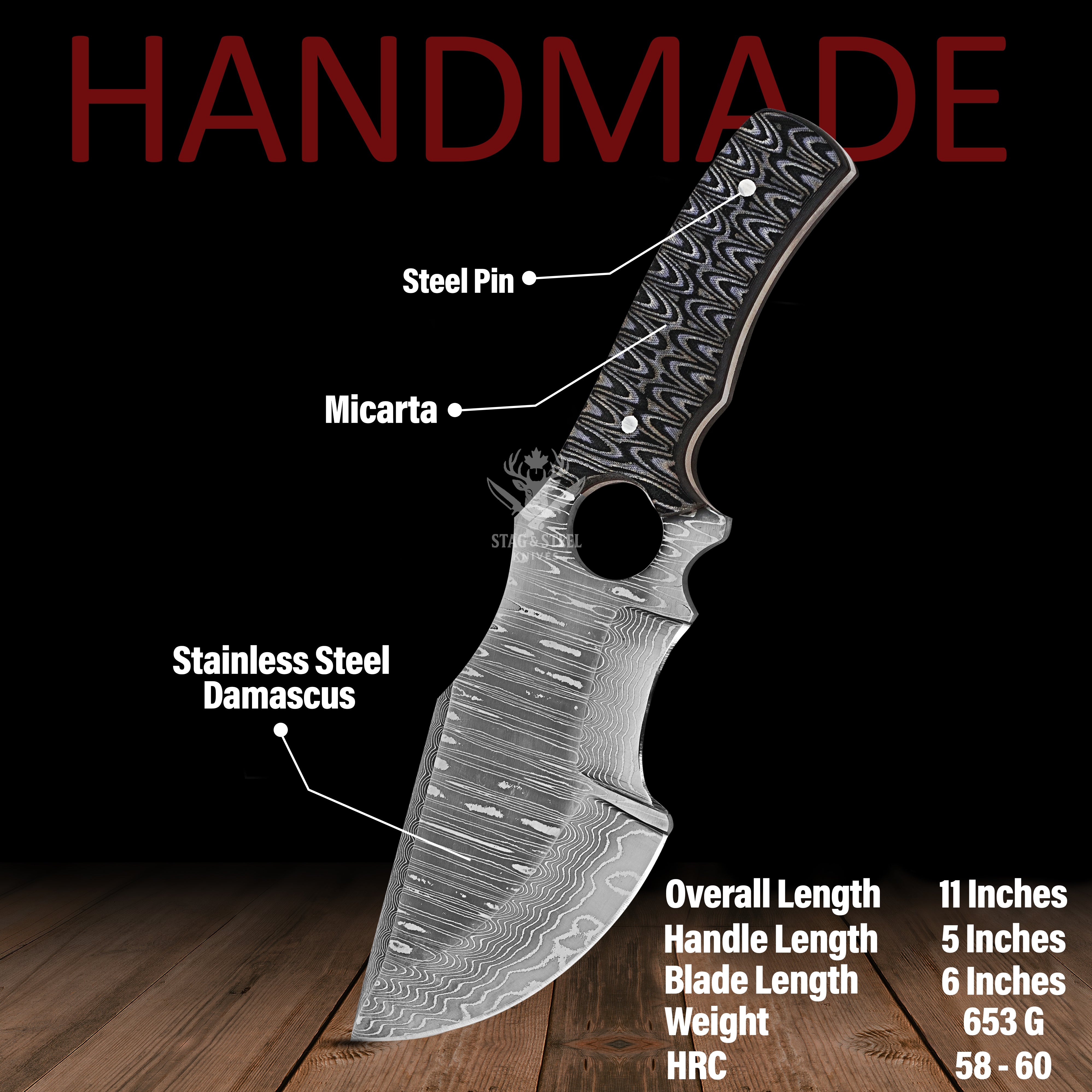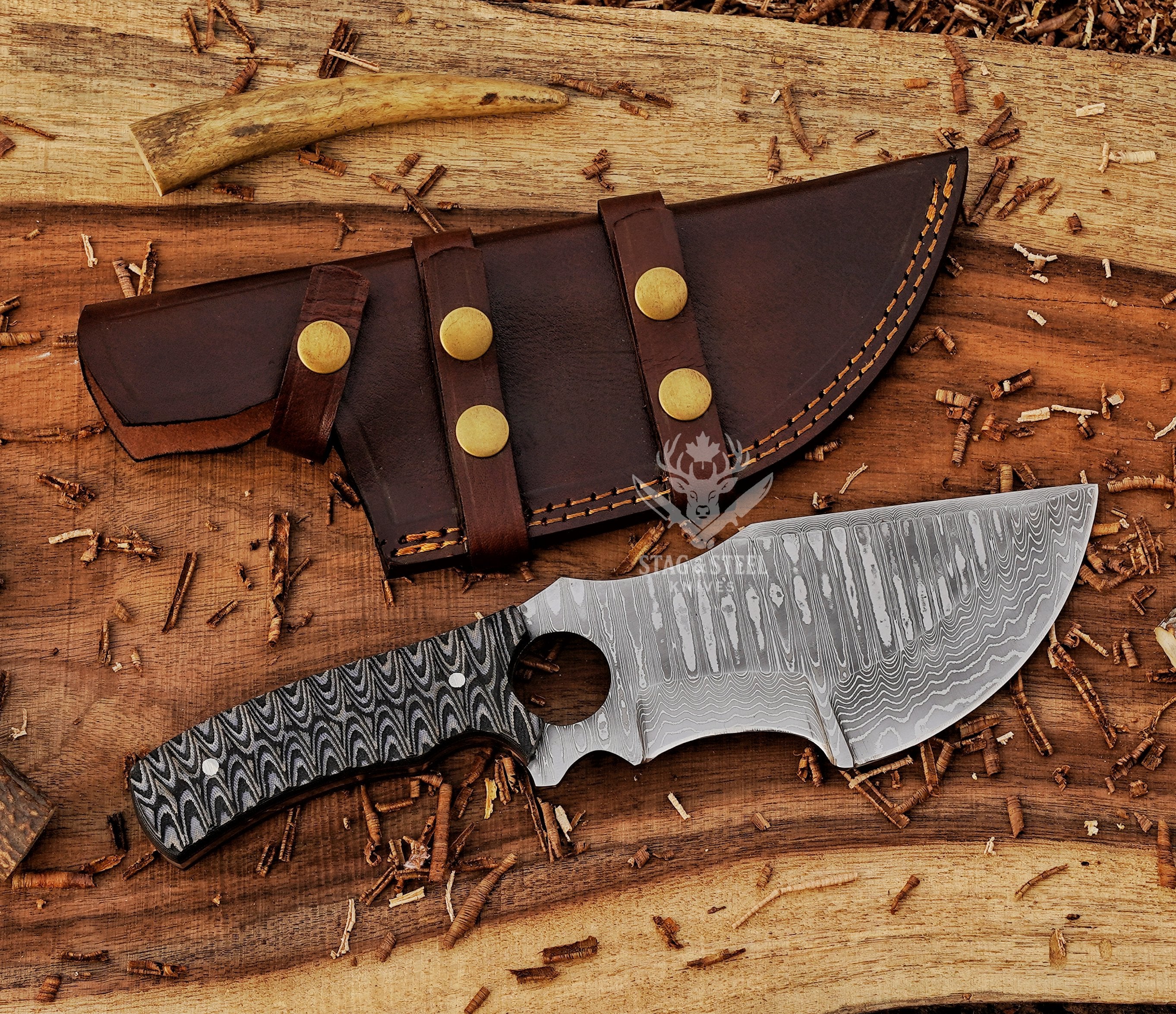 Bushcraft & Camping Fixed Blade—Hand-Forged Damascus, Micarta Handle, Leather Sheath
