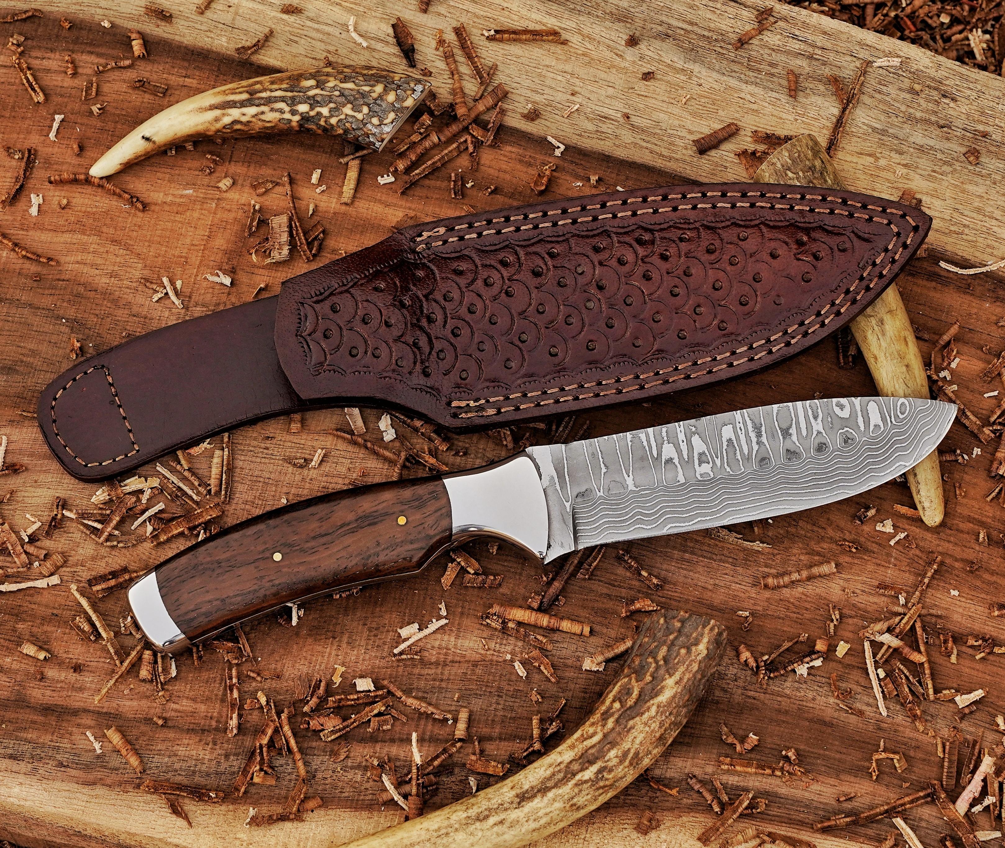 Bushcraft Knife | Stainless Damascus Steel Blade | Ironwood Handle | SS Bolsters & Leather Sheath