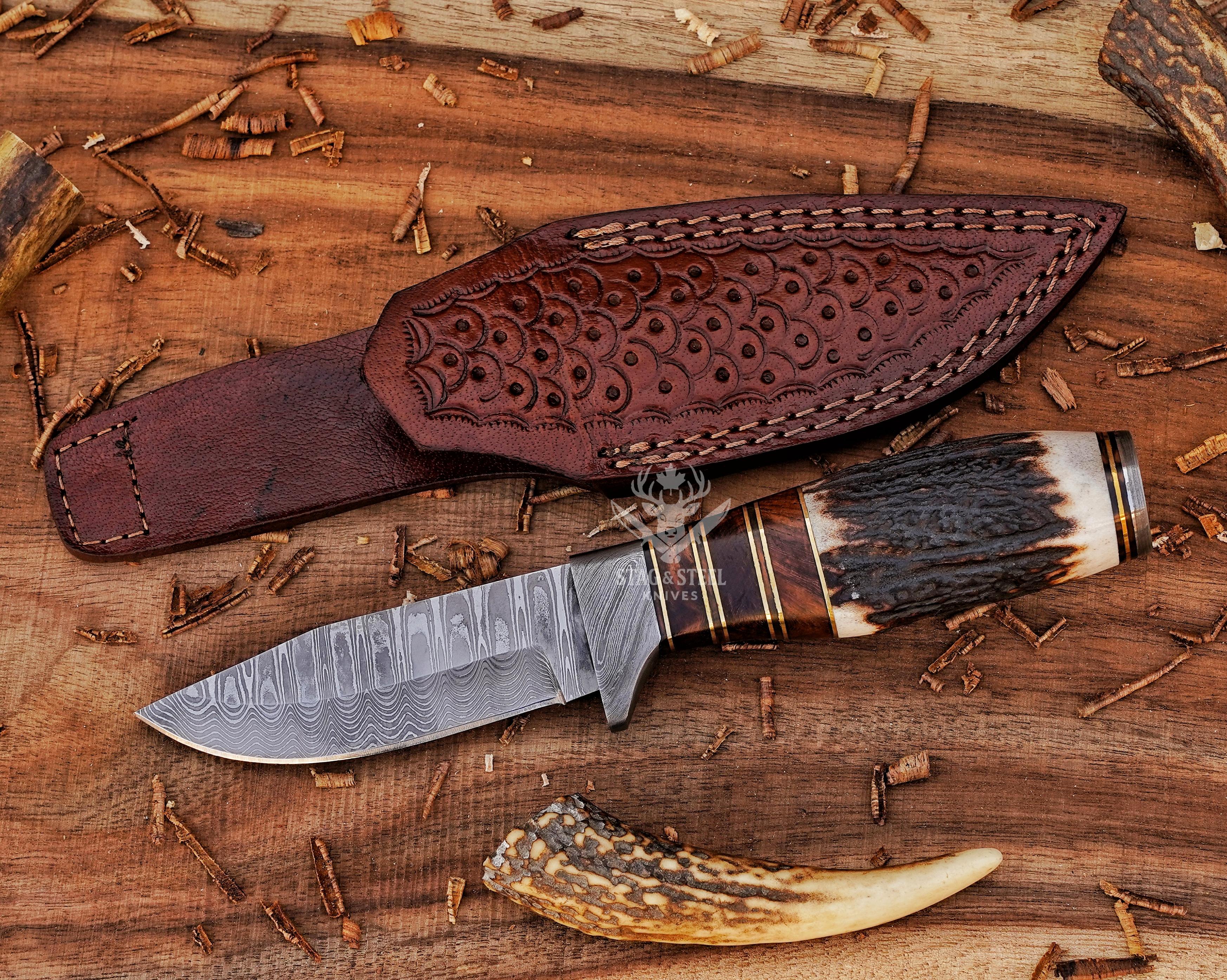 Custom Damascus Hunting Knife: Rosewood, Stag Horn Handle